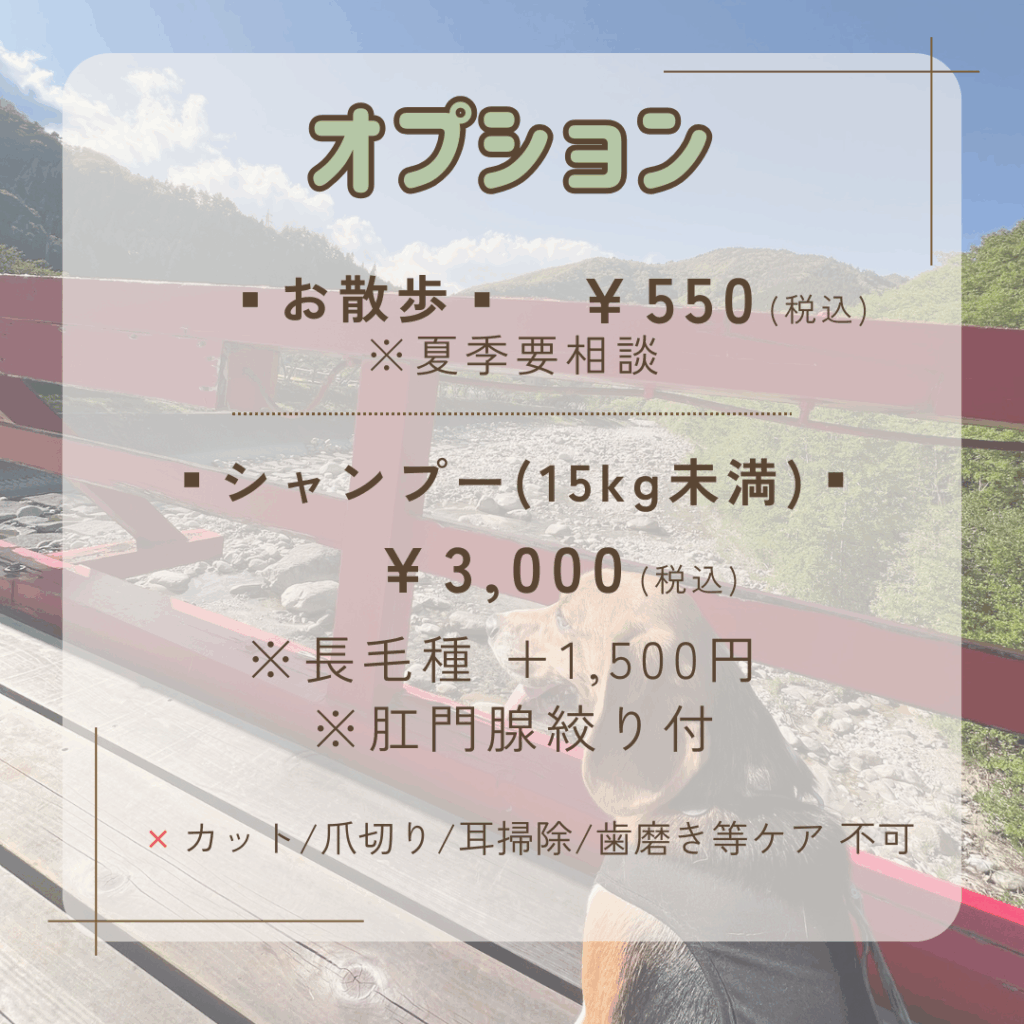 ※カット・バリカン・爪切り・耳掃除・歯磨き等のケアは行っておりません。