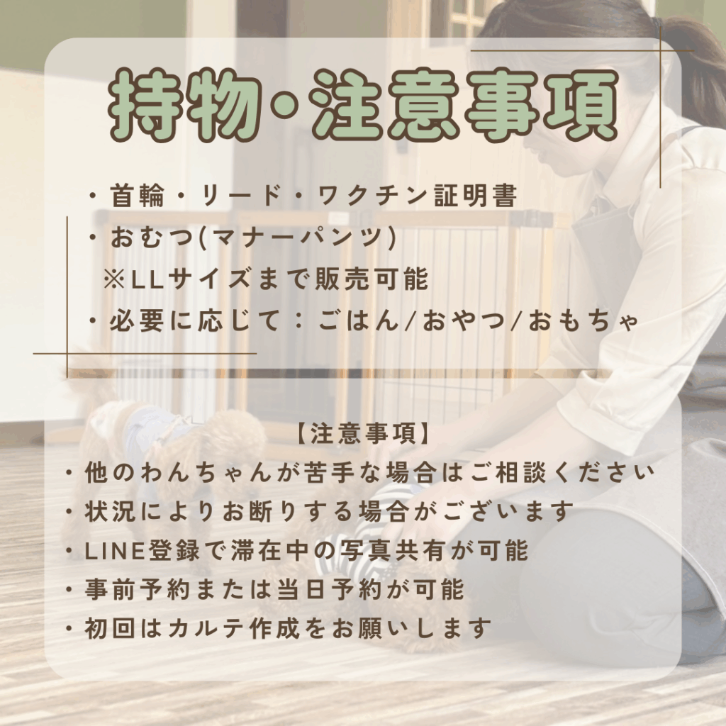 ・おやつ・ごはん・おもちゃ等、必要に応じてご持参ください。