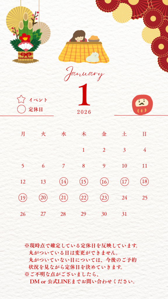 丸がついていない日については、今後のご予約状況を見ながら定休日を決めてまいります。